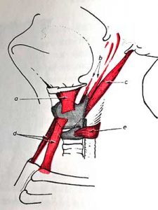 図のcが茎状咽頭筋、dが胸骨甲状筋です。