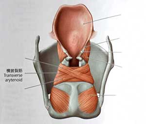 「い」の音を出す時、声帯を伸展させる役目の筋肉である輪状甲状筋と後輪状披裂筋が働きます。また声門(声帯ヒダの隙間)を閉じる役割を持つ横披裂筋と外側輪状披裂筋も目覚めさせられます。